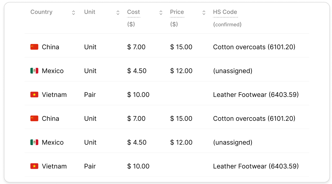 Auto-classify your catalog with AI-generated HS codes. One-click import from Shopify or upload via CSV.